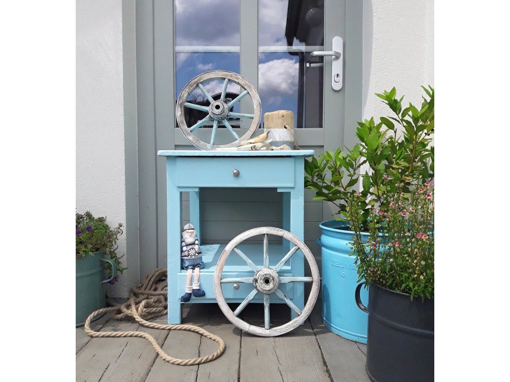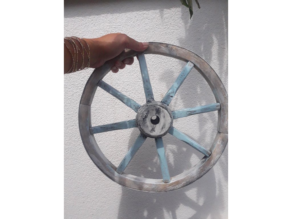 Úžasná originální dekorace - kormidlo - vyrobené ze starého kola. Kolo je klasické dřevěné s železným kováním. Nejedná se o žádnou repliku, ale opravdové kolo, které kdyby bylo součástí nějakého vozíku a určitě dlouhá léta sloužilo. Vám teď může posloužit jako doplněk do interiéru či na terasu, balkon, venkovní fasádu. Barvu jsem zvolila světle modrou a bílou - nicméně je natřeno tak, aby stáří kola bylo stále vidět. Vyniká tedy i staré železo s patinou a zšedivělé dřevo. Celková kombinace barev a vzhled tohoto kormidla je opravdu výjimečný.